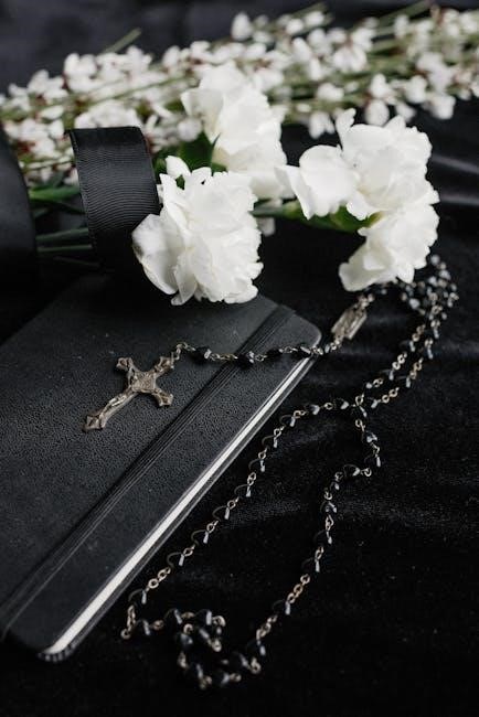 The Servite Rosary consists of specific elements designed to facilitate its unique devotion. It includes 49 beads‚ divided into seven groups of seven beads each‚ representing the Seven Sorrows of Mary. These beads are often separated by larger beads or medals to distinguish each group. A crucifix is typically attached to the rosary‚ symbolizing the central focus on Christ’s Passion. Additionally‚ some rosaries include medals depicting the Seven Sorrows. The structure is designed to guide the recitation of prayers and meditations‚ with each group of beads corresponding to one sorrow. This arrangement helps practitioners maintain focus and deepen their connection to Mary’s spiritual journey‚ emphasizing both the sorrowful and redemptive aspects of faith.