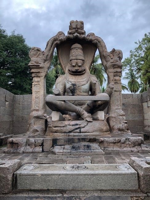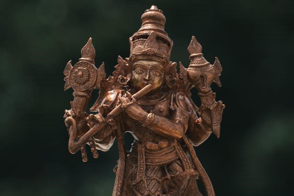 Vishnu, often blue-skinned and resting on Shesha, symbolizes preservation and cosmic order․ Accessing depictions alongside the Kannada PDF versions enhances understanding of these visual representations during recitation․